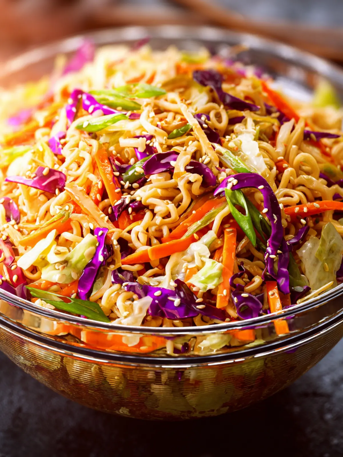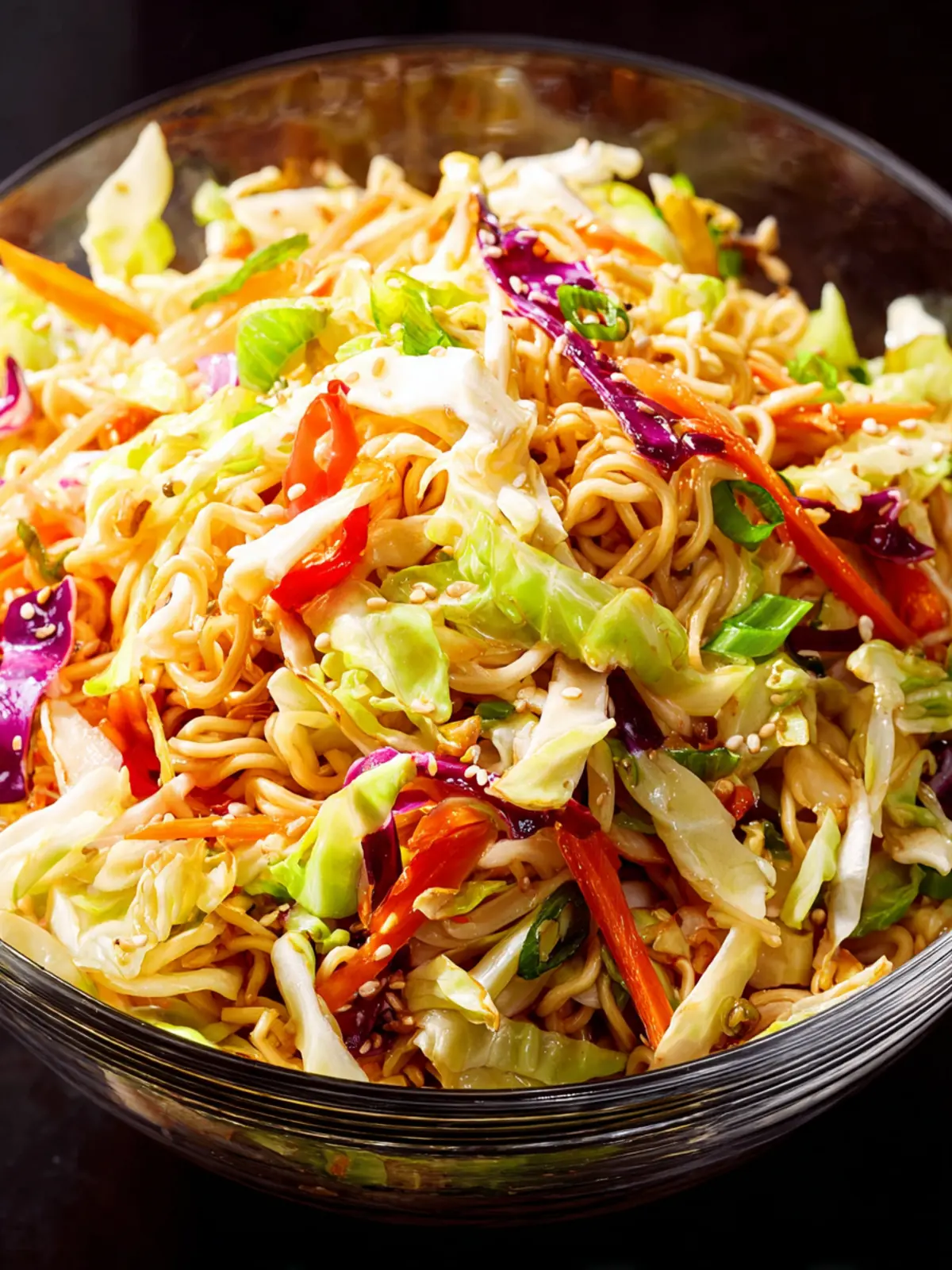 Delicious crunchy ramen salad with a blend of fresh vegetables and a tangy dressing.