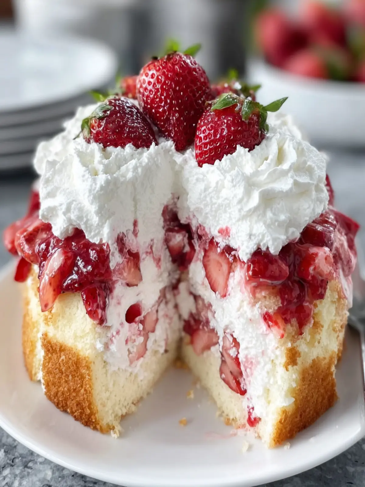 5. Assemble the Cake: Place one cake layer on a serving platter. Spread with half of the whipped cream and top with half of the sliced strawberries. Place the second cake layer on top and spread the remaining cream over the top and sides. Decorate with additional strawberries.