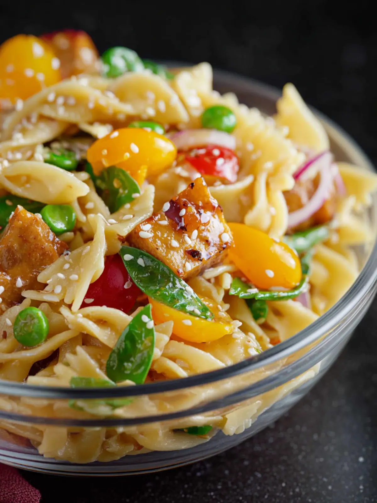 A delicious Asian-inspired pasta salad with bow tie pasta, vegetables, and a flavorful dressing.
