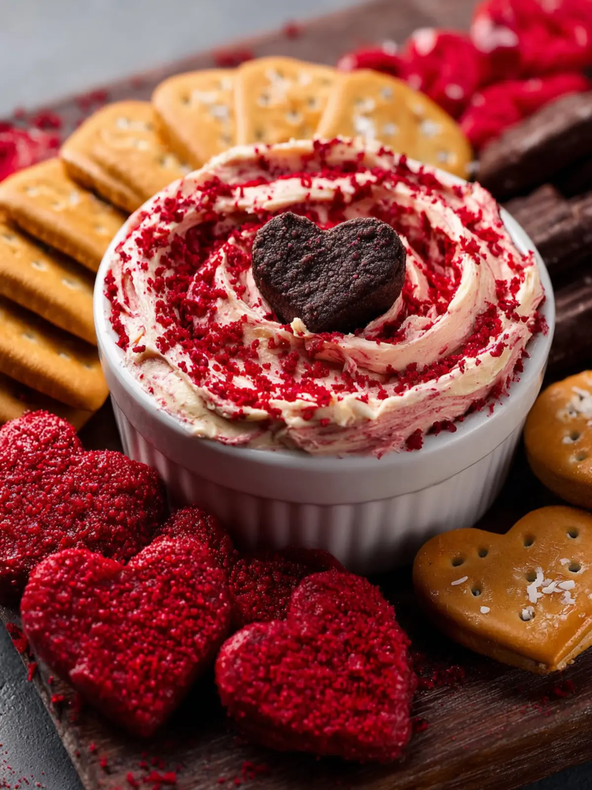 Pair your red velvet cheesecake dip with an array of crunchy and sweet dippers. Fresh fruit like strawberries and apple slices offer a refreshing contrast. Cookies, pretzels, or graham crackers add a delightful crunch, perfect for scooping up the dip.